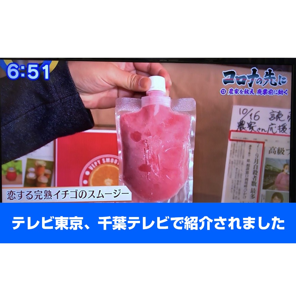 テレビ東京、千葉テレビでもご紹介いただきました「恋する完熟イチゴのスムージー」です。コロナ禍、観光農園さんの応援で、農産物廃棄ゼロを目指し、サステナブルな取り組みを考えて作りました。口を開けた瞬間、イチゴの香りがふわっと香ります。