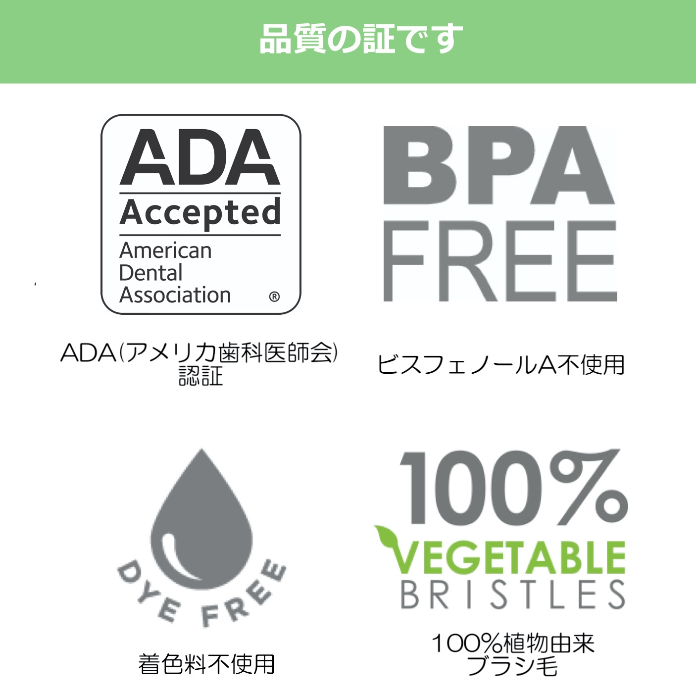 - ADA(アメリカ歯科医師会)認証。