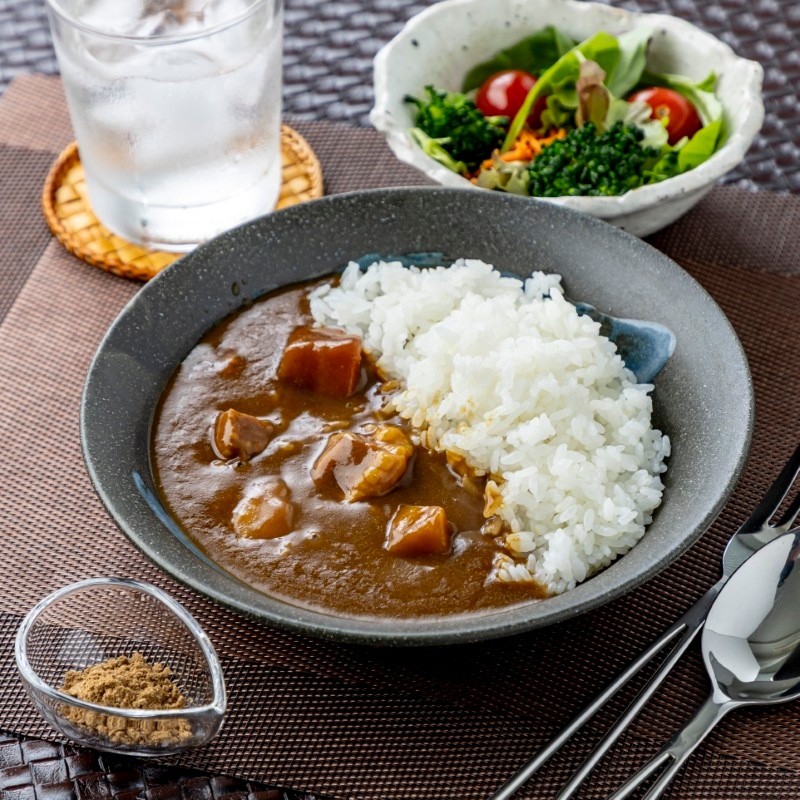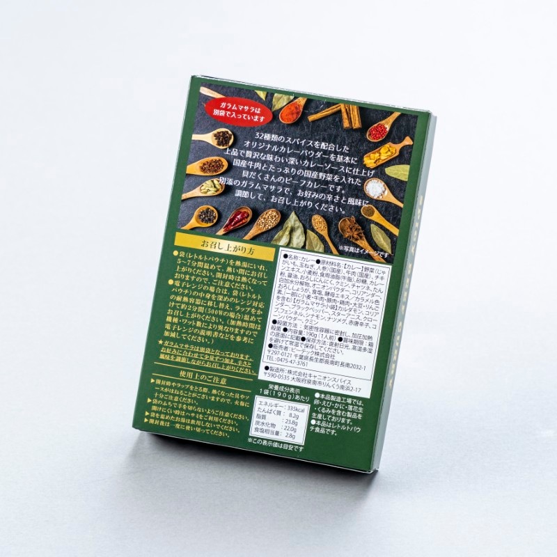 32種類のスパイスを配合したオリジナルカレーパウダーを基本に上品で贅沢な味わい深いカレーソースに仕上げ国産牛肉とたっぷりの国産野菜を入れた具だくさんのビーフカレーです。付属のガラムマサラで、お好みの辛さと風味に調節して、お召し上がりください。