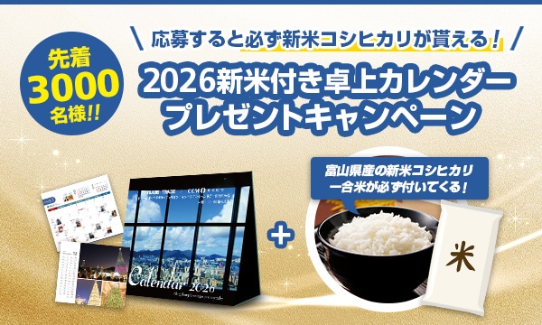 【好評実施中】富山産コシヒカリ新米付き!2026年版卓上カレンダーを先着3,000名様にプレゼント