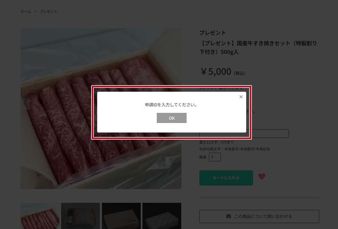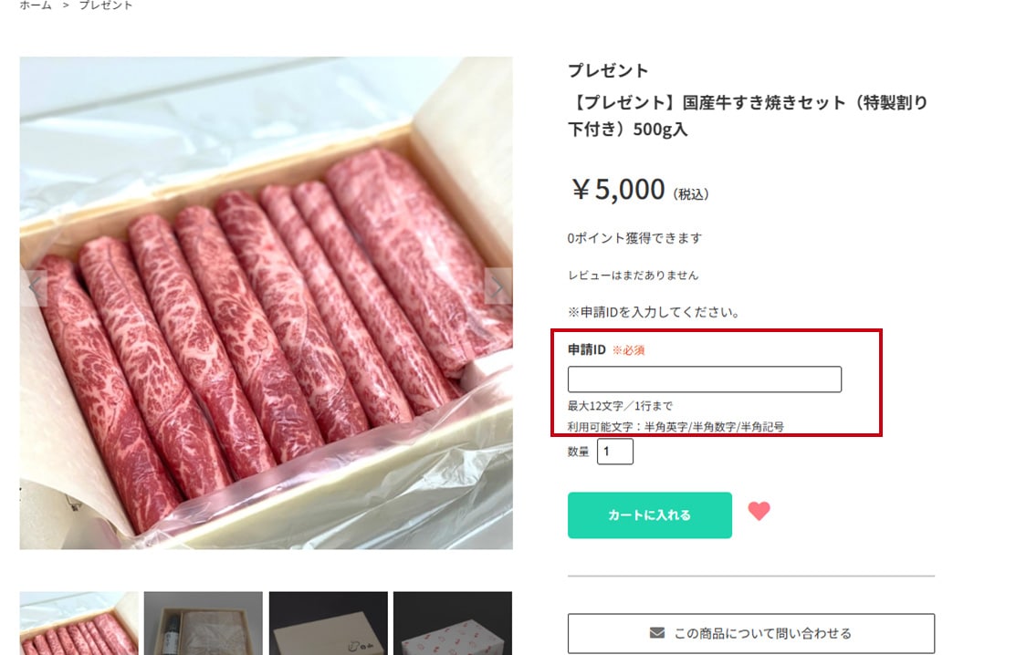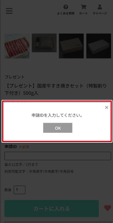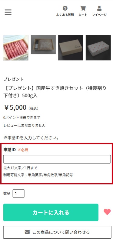 1.クーポンコードの対象商品のページに移動し、お手元にある「申請ID」(またはお問合わせIDなど)を入力し、商品をカートに入れます。