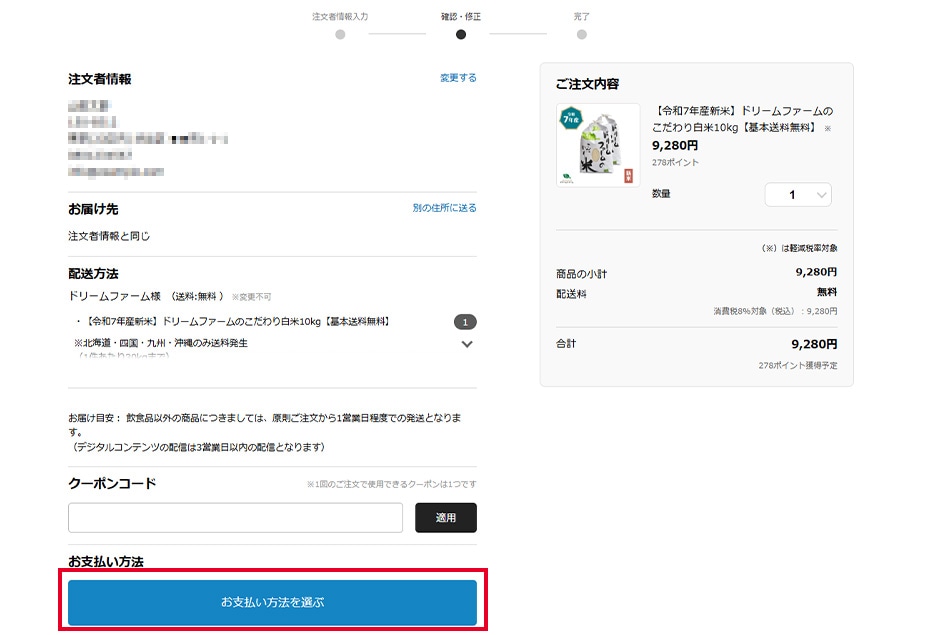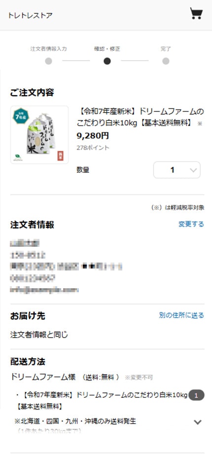 確認画面にて、「ご注文内容」、「注文者情報」、「お届け先」内容を確認します。