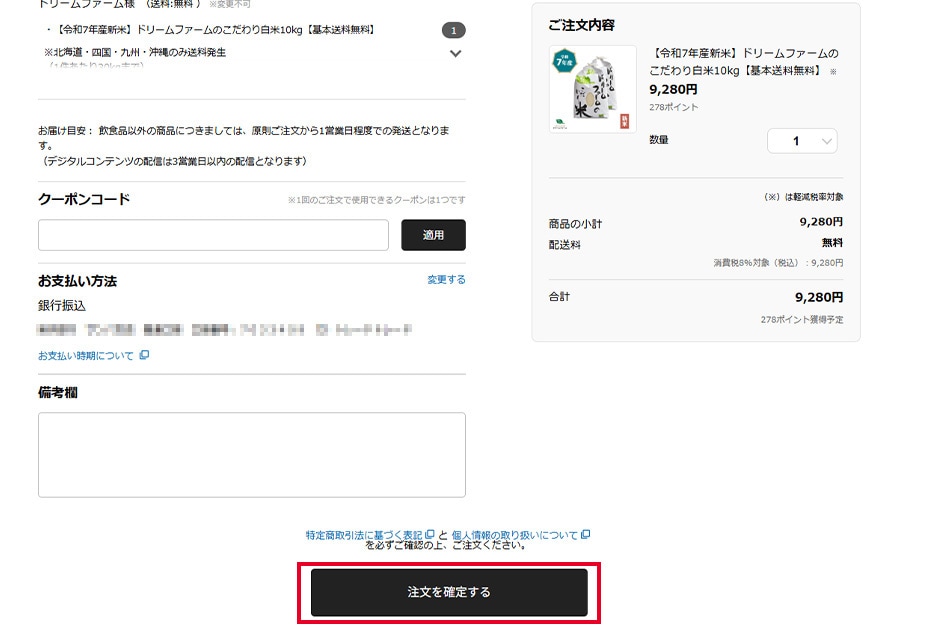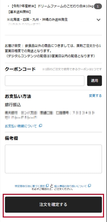 6.ご注文内容に相違ないかを確認し、「注文を確定する」ボタンで注文を確定します。